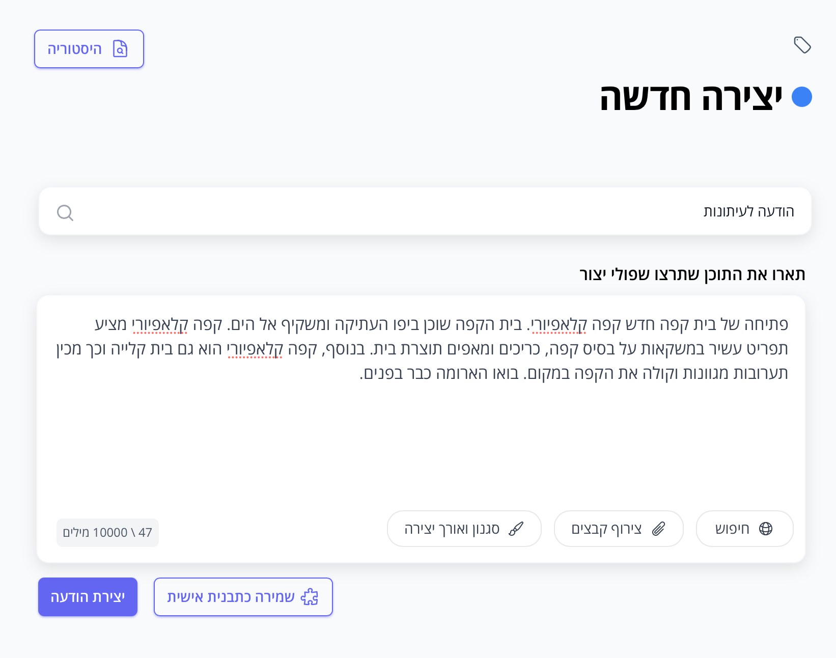 כתיבת הודעה לעיתונות בעברית עם פולי AI היא פשוטה. ראשית, ודאו בסרגל העליון, כי אתם נמצאים על יצירת טקסט. לאחר-מכן, המשיכו לפי השלבים הבאים: