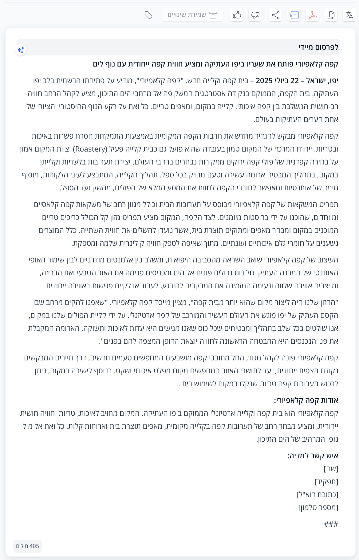 בגוף ההודעה, ספקו פרטים חיוניים, כולל ציטוטים מבעלי עניין מרכזיים כדי להוסיף אמינות ואישיות. הדגישו מידע משמעותי והימנעו מז'רגון כדי לשמור על המסר ברור ונגיש. ודאו שהטון מקצועי ותמציתי. מומלץ לכלול תמונות וקטעי וידאו קצרים רלווטיים