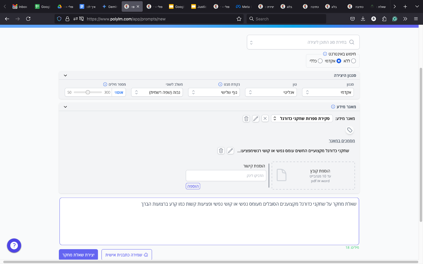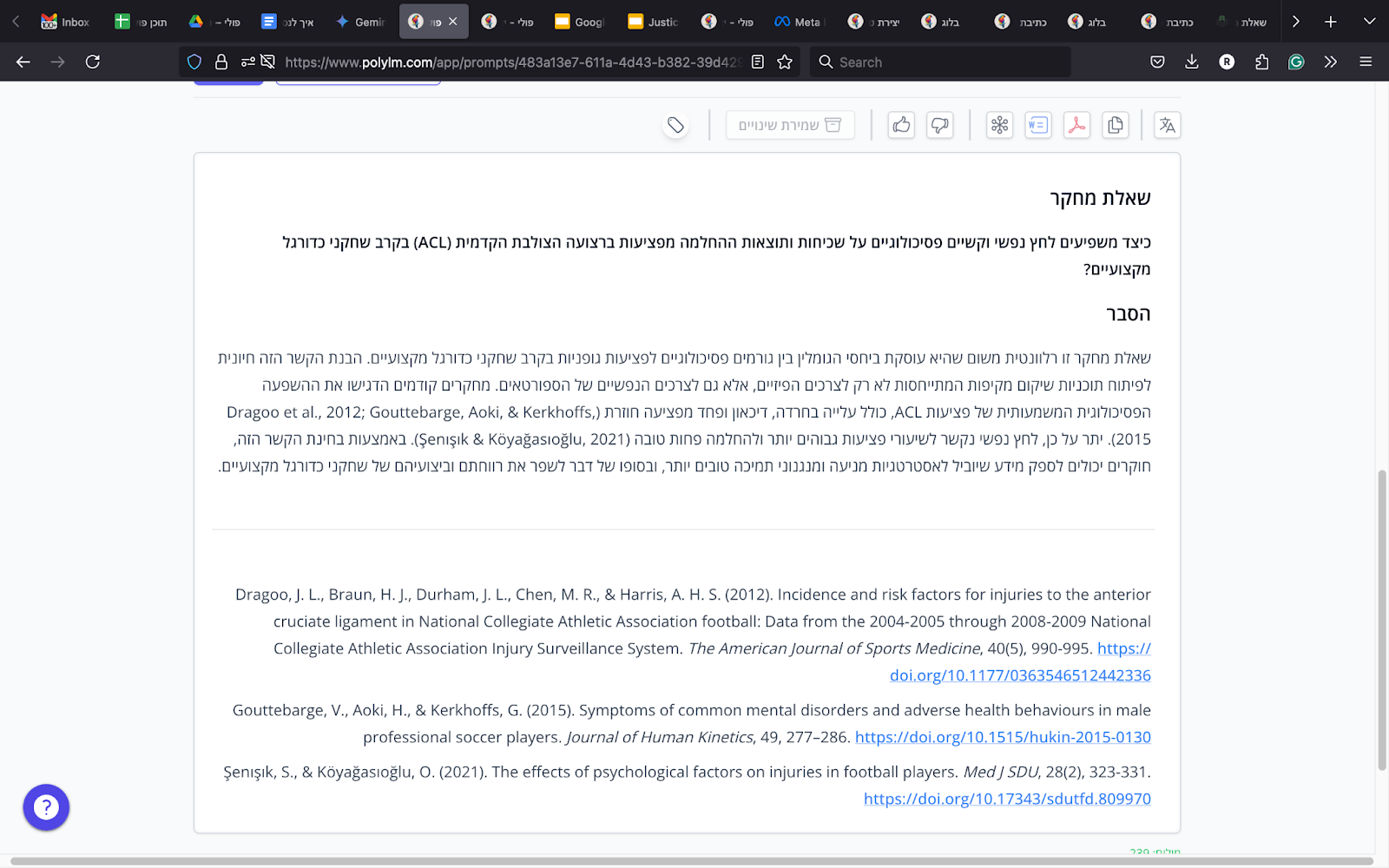 לבסוף, כתבו בתיבת ההנחיה של פולי את הכיוון לשאלת המחקר שלכם ולחצו על כפתור יצירת שאלת מחקר. נמשיך עם הדוגמה של שחקני הכדורגל, העומס הנפשי והפציעות ובתיבת ההנחייה, ביקשנו מפולי שיכתוב עבורנו את שאלת המחקר בנושא, לאחר שהעלנו את סקירת הספרות.