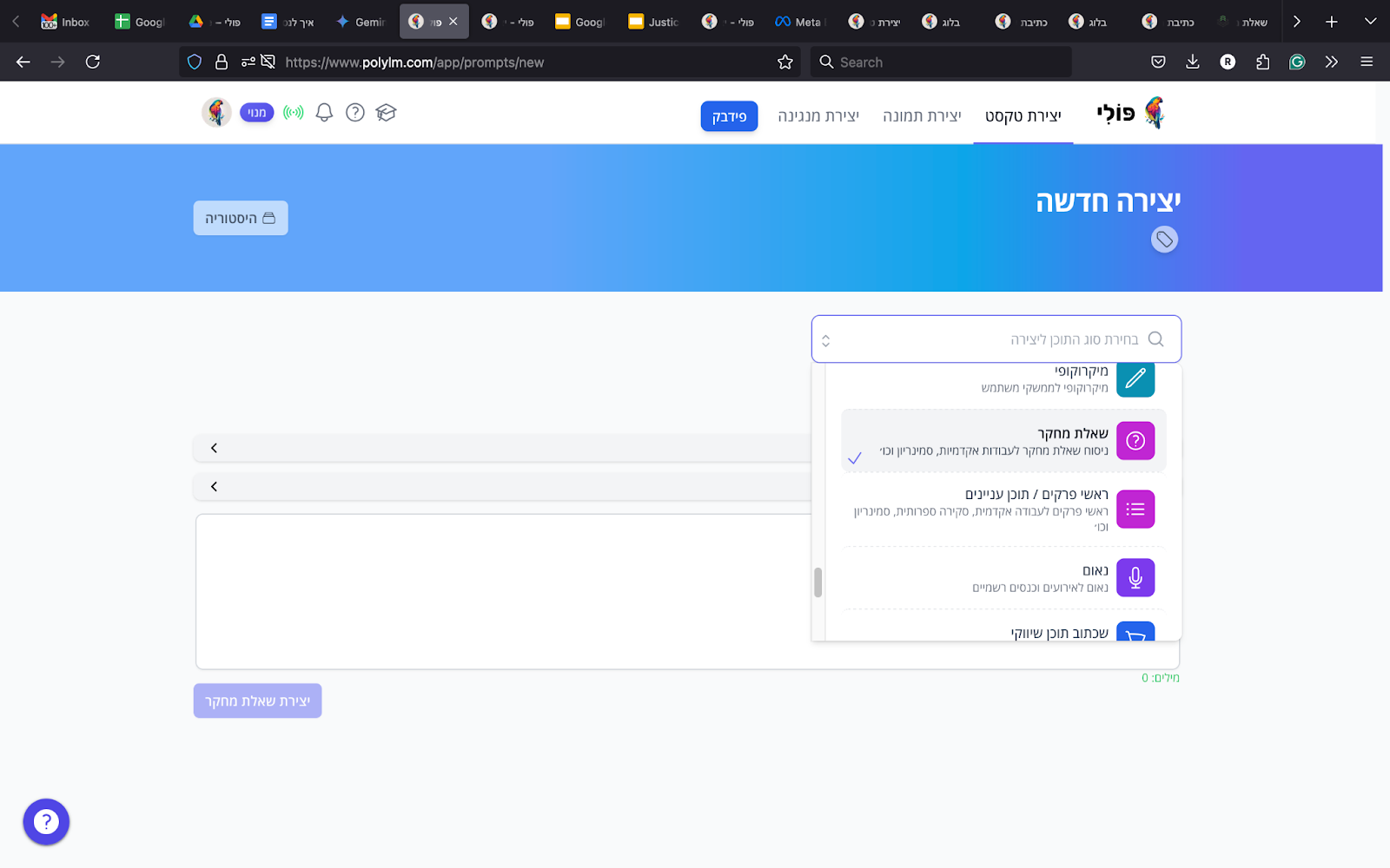 ראשית, בדף הבית של פולי, הכנסו אל יצירת טקסט ובחרו בסוג התוכן: שאלת מחקר.